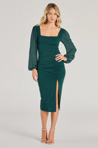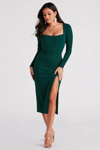Sophisticated and chic, the Murphy formal midi dress is a perfect choice for a wedding guest outfit! She features a square neckline, a corset-designed bodice with flexible boning to provide structure, long fitted sleeves, a midi-length, curve-hugging silhouette, and a high front slit to show off some leg. The crepe fabric offers a moderate stretch. Style with strappy heels and a sleek clutch.