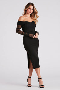 Step out and be seen in the Debby formal midi dress to create an elegant entrance at birthday dinners and art galas! She features an off-the-shoulder neckline, sheer long fitted sleeves with ruched detailing, a form-hugging silhouette, and a sultry side slit to showcase some skin. The formal dress is composed of a crepe fabrication that offers moderate stretch. Complete the look in simple stiletto heels.