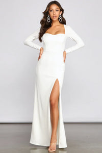 Look oh-so-stunning and create a gorgeous silhouette in the beautiful Kayla formal dress! She features long fitted sleeves, a subtle sweetheart neckline, and a sexy open back with a lace-up design. Her slim-fit bodice flows out to a floor-sweeping length with a thigh-high slit. Pair this dress with a rhinestone cuff for some added glam to complete your night-out look.