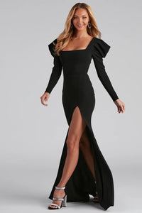 Bring the elegance in a formal dress that brings that timeless grace to your evening. Tayla features a square neckline, long fitted sleeves with puff shoulder accents, a high side slit, and a mermaid silhouette. The dress is composed of a crepe fabric that offers a form-hugging fit with a moderate stretch. Complete look with rhinestone heels and a rhinestone anklet.