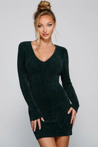 Have a gorgeous glitzy moment at homecoming in this stunningly chic mini dress. The short dress features a V-neckline, long fitted sleeves, a short, curve-hugging silhouette, and is composed of a glitter knit fabric with a stylish all-over textured pattern. Complete the look with strappy stilettos.