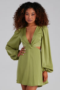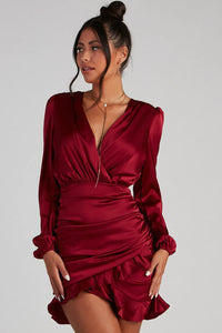 Create a chic romantic look in this sleek satin mini dress with flirty ruffle detailing! It features a V-neckline with a pleated wrap-front design, long sleeves, a high waist seam, and a short wrap skirt with ruching down the sides and ruffled hems. Style this dress with gold hoop earrings and strappy heels.