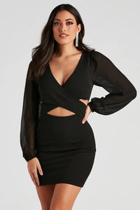 You'll be coveting this crepe short dress to wear for all of your dressy occasions! The dress features chiffon peasant sleeves, a V-neck, cutouts along the wrap waist, and a short, curve-hugging silhouette. The crepe fabric offers a moderate stretch. Perfect for styling with fringe earrings and heels.