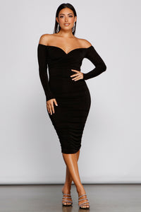 Classic and chic, the Penelope midi dress is perf for your next cocktail party. She features an off-the-shoulder V-neckline with a wrap-front design, long fitted sleeves, side ruched detailing, and a mid-length, form-fitting silhouette to hug your curves. Style this dress with glitzy rhinestone earrings and strappy heels.