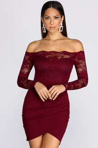 Bring the glam with a little lace action! This mini dress features a partially unlined floral bodice, an off the shoulder neckline, a sweetheart lining and fitted long sleeves. The slim fit bodice leads to a curve hugging mini length silhouette with a pretty envelope hem. Dress is composed of a combination lace and crepe fabric that offers a moderate stretch. Includes a back zipper closure.
