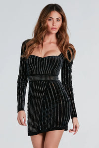 Ready to make an unforgettable impression? This rhinestone mini dress is perfect for your next dressy occasion or bachelorette night out! With sheer fitted long sleeves, a sheer mock neckline, and a bodycon silhouette on rhinestone embellished mesh fabric that sparkles under the light. Complete the look with high heels.