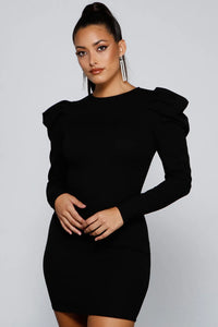 This chic bodycon mini dress will bring that dramatic flair you love to your look. It features a crew neckline with a back button closure, puff shoulders with long fitted sleeves, and a short, form-hugging silhouette. Style this dress with strappy stilettos.