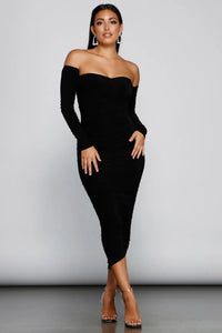 Chic and sophisticated, the Jolene formal midi dress is a stunning pick for rehearsal dinners or cocktail soirees! She features a chiffon bodice with an off-the-shoulder neckline, sheer peasant long sleeves, and a V-wired front. Her form-hugging silhouette offers a flattering front slit and a midi-length hem. The formal dress is composed of a crepe fabric with a sewn-in knit lining and plenty of stretch. Complete the look in sparkly platform heels.