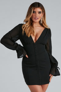 Showcase a chic look for date night with your special someone in this alluring bodycon dress! It features a wide V-neckline, long sheer chiffon bishop sleeves with flared hems, a V-back design, hook and eye front closures with a corset waist design, and a mini-length, curve-hugging silhouette. Complete the outfit with sparkly rhinestone earrings and clear heels.