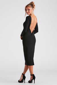 When last-minute plans arise this long sleeve midi dress rises to the occasion in chic style! The fitted long sleeves and bodycon silhouette hug your curves, while the square neckline flatters your bust. The tie-back design cinches your waist and the front slit adds a modern twist to this midi-length dress. Complete the look in stiletto heels for a dressy date night or cocktail party!