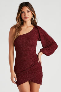 Showcase a chic glam moment in this gorgeous glitter knit mini dress. It features an asymmetric one-shoulder neckline with a single long puff sleeve, a faux wrap hem with pleated detailing, and a short, curve-hugging silhouette. The glitter knit fabric offers a moderate stretch. Style with sleek gold hoops.