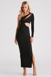 Sequin dresses make sure every eye will be on your dazzling aurora and the Malika formal midi dress is no exception! She features a chic one-shoulder neckline adorned with a fitted long sleeve, an asymmetrical pleated accent, and a form-hugging silhouette revealing a sexy side slit design. The formal midi-length dress is crafted from a sequin embellished lined fabric that brings the sparkle. Complete the look with earrings and heels for a holiday party!