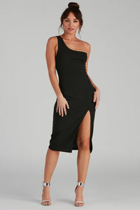 Showcase your sophisticated style in the Summer midi party dress for every special occasion this season! She features a head-turning strappy back and a one-shoulder neckline, fitted bodice, and a high-cut slit on a midi hemline perfect for showing off some skin. The party dress is composed of a crepe knit fabric with a moderate stretch. Complete your look in radiant rhinestone heels and a matching clutch.
