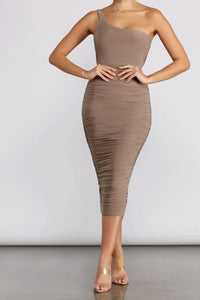 Classic and sleek, this stretchy knit midi dress features an asymmetric off-shoulder neckline with long fitted sleeves, ruching at the waist to accentuate your curves, and a bodycon silhouette. Style with stiletto heels for a chic outing!