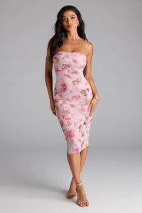 Experience effortless elegance in this floral midi dress for dressy occasions! The strapless neckline accentuates your shoulders while the bodycon silhouette flatters your curves.