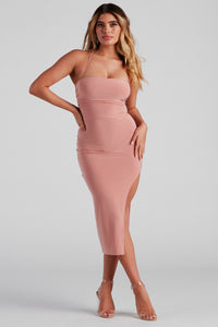 The Laila midi dress offers a playful twist for cocktail parties and dinner dates! She features a sleeveless sweetheart neckline, adjustable spaghetti straps, a twisted bust with a keyhole cutout, a form-hugging silhouette, and a flirty front slit along the hem. The formal dress is composed of a lined crepe fabric with a moderate stretch. Complete the look with hoop earrings and heels.