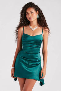 Show off that flirtatious flair in this sleek satin A-line mini dress! It features a sleeveless sweetheart neckline, spaghetti straps, a fitted bodice and waist with ruching, a mini-length asymmetric hem with a longer design on each side, and an A-line silhouette. The satin-knit fabric has a moderate stretch. Style with rhinestone fringe earrings and metallic heels!