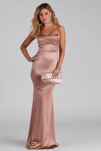 Sleek and stunning, you'll fall head over heels for the Ciara sleeveless satin formal dress. She features a sweetheart neckline with a cowl neck draped design, padded cups, spaghetti straps, a flattering high waist, and a floor-length fitted silhouette. The smooth satin-knit fabric offers a moderate stretch. Complete your look with sparkling rhinestone heels.