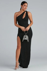 Sweet and stunning, the Evette glitter one-shoulder slit formal dress will make a lasting impression throughout the night! She features a sultry knotted one-shoulder strap with a slit accent and seam detailing along the fitted empire waist. Flaunt your curvy figure and show some leg in her form-fitting maxi silhouette with high-side slit detail. This formal dress is composed of a textured glitter knit-lined fabric with a moderate stretch. Complete the look in a rhinestone tiara.