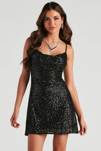 Oh-so-alluring, create a bold formal look in the Marie sleeveless sequin mini dress. She features a draped cowl neckline, adjustable spaghetti straps, an open back with a lace-up strappy design for a customized fit, and a short, curve-hugging, bodycon silhouette. The lined mesh fabric features all-over sequin embroidery in a chic scroll pattern. Complete the outfit with classic stiletto heels.