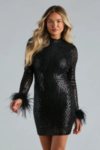 The Juliette sequin dress was made to be seen on you at banquets, holiday parties, and fancy events! She features fitted long sleeves with fabulous marabou trim cuffs, a mock neckline, and a flattering bodycon silhouette and knee-length hem. The party dress is designed with a sequin-embellished striped pattern that sparkles on mesh fabric and has a stretchy knit lining. Complete the look with earrings and strappy heels!