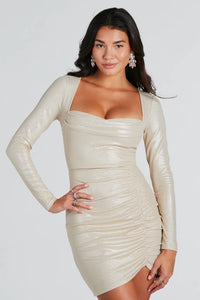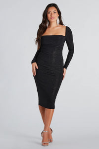 This glitter midi dress will be a hit at every party! Featuring a cowl neckline, fitted long sleeves, and side ruched seams to accentuate your curves, this bodycon dress will have all eyes on you and your sparkling glitter ensemble. Complete the look with a clutch for a birthday or banquet!