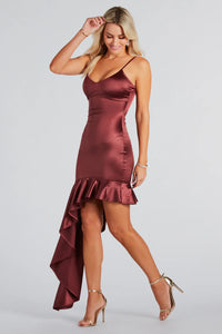 Crafted from luxurious satin, the romantic Cecelia formal high low dress is the perfect style to make an entrance at holiday galas or weddings. She features a V-neckline, spaghetti straps, an underbust seam, and a flattering bodycon silhouette and high low hem with a cascading ruffle that brings the drama! Complete the look in strappy rhinestone heels and a clutch.