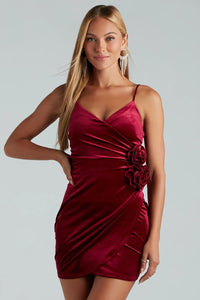 Elevate the romance on your next dinner date in this rosette velvet mini dress! It features a sleeveless V-neckline with a surplice design, spaghetti straps, a high waist seam with dual chic rosette appliques, a mini-length hem with a wrap-front design, and a bodycon silhouette. The smooth velvet fabric has a moderate stretch. Complete your look with a sleek clutch and strappy stilettos.