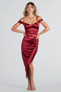 This satin midi dress ensures you'll make a stunning arrival at parties and dressy occasions! Crafted from luxe satin fabric, the midi-length dress features an off-the-shoulder V-neckline, short-sleeve cuffs and spaghetti straps, a form-hugging silhouette, and a front ruched seam that leads to an asymmetrical cut hem. Complete the look in rhinestone heels.