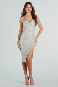 Cocktail dresses are the definition of effortlessly chic, perfect for any night out or soirée. From trendy short silhouettes to polished midis and elegant long styles, these looks flatter every figure. Go sleek in a strapless sheath, timeless in an A-line, playful in a fit and flare, or bold in a dramatic mermaid-style design. Fabrics like satin, glitter knit, beaded mesh, and rhinestones bring elevated glam. Necklines from halter and off-the-shoulder to cowl and corset bodice keep the vibe fresh, while open-backs, illusion panels, cutouts, ruching, and ruffles make every dress unforgettable.