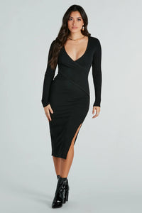 Create an adorable winter 'fit with this wrap-front midi dress you'll want to wear all season long. It features a V-neckline with a chic surplice wrap-front design, long fitted sleeves, a midi-length hem with a high-cut side slit, and a form-hugging silhouette. The ribbed knit fabric offers plenty of stretch. Complete your look with a moto jacket and sleek ankle boots.