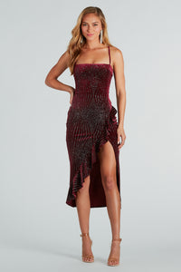 It's time for glitz and glamour with this glitter velvet midi dress that will make a stunning entrance. Crafted from gorgeous glitter velvet fabric, this mid-length dress features a sleeveless square neckline, spaghetti straps that lead to a cross-back design, an asymmetric hem creating a thigh-high front slit with a ruffled trim, and a slim-fit silhouette. Complete your cocktail party look with stiletto heels.