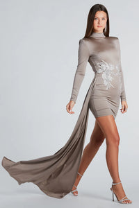 The exquisite Shania mini dress will make you look and feel like a work of art! She features fitted long sleeves, shoulder pads for structure, and a mock neckline, this mini dress exudes sophistication and elegance. The bodycon silhouette, attached side floor-length sash, and gorgeous rhinestone beaded applique make for an eye-catching ensemble. The mini dress is composed of a smooth knit fabric with plenty of stretch. Complete the look in statement platform heels for a black tie party or red carpet occasion.
