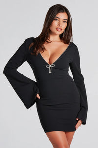Bring the iconic glamour to your next dressy party in the Alaina formal mini dress! With her chic allure and radiant rhinestone detailing, you'll receive all the compliments. She features a sultry plunging V-neckline with a dainty rhinestone trim, a small rhinestone bow at the center of the bust, a V-back design with a matching rhinestone trim and a back zipper closure, long dramatic bell sleeves, a mini-length hem, and a bodycon silhouette to flaunt your figure. The crepe fabric offers a moderate stretch. Complete your look in this mini dress with sleek pumps.