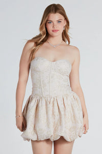 Create a dreamy look worthy of your next formal affair in the Elisa floral jacquard bubble hem skater dress! She features a strapless sweetheart neckline with a padded bust, a chic corset-designed bodice with flexible boning detail, a high waist seam, a short skater skirt with pleated detailing, a fabulous bubble hem, and a fit and flare silhouette. The luxe woven fabric features a lovely floral jacquard pattern with a gold stitched trim. Complete your gorgeous look in this short dress with a dainty rhinestone necklace and stiletto heels.