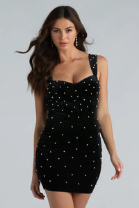 This faux pearl-embellished velvet mini dress will keep your dressy party 'fits chic and sophisticated! It features a classic sweetheart neckline with tank shoulder straps, corset-designed seams, a mini-length hem, a bodycon silhouette to flaunt your gorgeous curves, and an all-over contrast design of dainty faux pearl embellishments on the luxe lined velvet fabric. Style this short dress with rhinestone duster earrings and silver heels for a holiday soiree!