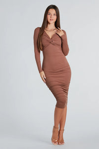 Get twisted up in this stylish midi dress! The rib knit dress features fitted long sleeves, a V-neckline, a twisted bust accent, and a bodycon silhouette with flattering side ruched seams and a midi-length hem perfect for styling with your favorite booties or heels. Complete the look in best-selling shoes to make a fabulous statement this season!
