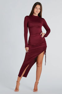 This alluring mock neck high slit midi dress needs to be in your winter lineup! It features a mock neckline, long fitted sleeves, a trendy ruched side seam with an adjustable drawstring, an asymmetric midi-length hem creating a high-cut side slit, and a form-hugging silhouette to flaunt your figure. The brushed knit fabric offers plenty of stretch. Style this midi dress with ankle booties!