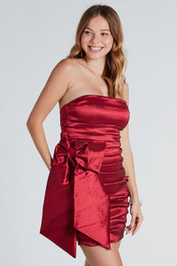 - Plunging V-neckline, rhinestone trim, front rhinestone bow design
