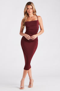 This sleek bodycon midi dress will show off your stunning silhouette! It features a sleeveless cowl neckline, spaghetti straps, an alluring open back with a cross-back and lace-up strappy design for a customized fit, ruching at the waist, a midi-length hem, and a bodycon fit to highlight your gorgeous curves. The lightweight knit fabric offers plenty of stretch. Style this midi dress with rhinestone heels to add some glamour for a party!