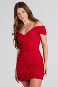 Conquer the night looking extra stunning in this mesh mini dress at parties or somebody's plus one! This mini-length dress features an off-the-shoulder neckline, short-sleeve cuffs, adjustable spaghetti straps, and a surplice bust. Ruched side seams and faux pearl-embellished mesh fabric add an elegant touch to the bodycon silhouette. Complete the look with teardrop earrings.
