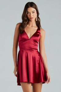 Experience the perfect blend of beauty and elegance with this Macie satin skater dress at homecoming and formal parties! Featuring a sleeveless plunge V-neckline and an open lace-up back for a customized fit, this dress will flatter your figure and add glamour to your look. Enjoy a classic skater silhouette in a short-length hem made from luxurious satin-knit fabric. Complete the look with gorgeous rhinestone jewelry to add an elegant shine!