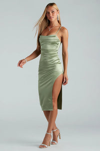 Exquisite Chic Satin Cowl Neck Slit Midi Dress