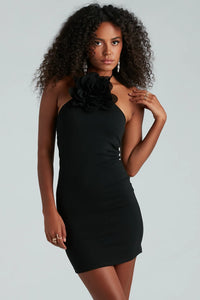 This rosette halter mini dress will have you looking oh-so-chic and ready for romance! It features a sleeveless halter neckline with a bold textured rosette flower applique, tie-back halter straps, a mini-length hem, and a bodycon silhouette that will hug your curves. The crepe fabric has a moderate stretch. Complete your dressy dinner date look with strappy stilettos.