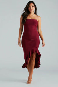 A crush that's timeless? Yourself in this sleeveless midi dress! It features a square neck, spaghetti straps, a flattering bodycon silhouette, and a high-low ruffled midi-length hem on smooth knit fabric. Complete the look with a chic crop jacket and heels for a party!