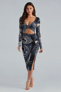 You'll be the artsy muse in this abstract print mesh midi dress for gallery openings or an evening downtown! It features a strapless cowl neckline, flattering side ruched seams that accentuate your curves, a bodycon silhouette, and a side slit accent. Complete the look in clear strap heels for a seamless style!