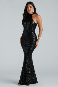 The Sallie formal sequin dress will make a sparkling statement at black tie events or red carpets! This sleeveless beauty is designed with a halter neckline, a flattering mermaid silhouette, and a floor-length hem. The luxurious mesh fabric is adorned with eye-catching sequins in a filigree pattern that will sparkle in any light and has a stretchy knit lining. Complete the look with fringe earrings and a clutch.