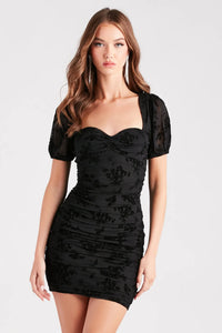 The perfect LBD for a dressy date night, the Terra flocked velvet mini dress will bring that chic flair. She features a sweetheart neckline with a build-in padded bust and center ruching, sheer short puff sleeves, ruching down the side and back seams, a mini-length hem, and a bodycon silhouette that will hug your natural curves. The lined mesh fabric features a floral flocked velvet pattern. Style with lace-up heels.