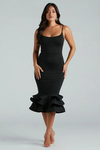 You have a flair for the dramatics, so the chic Thea formal ruffle hem midi dress is a perfect match for your next fancy soiree! She features a sleeveless scoop neckline, adjustable spaghetti straps, a slim-fit silhouette, and a midi-length hem with a bold tiered ruffled hem with a thin netted interior design for a voluminous flared-out look. The smooth and slinky knit fabric includes a midi-length lining and offers plenty of stretch. Complete your outfit with rhinestone chandelier earrings and strappy stilettos!