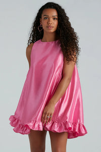 - A-Line silhouette, ruffled short-length hem